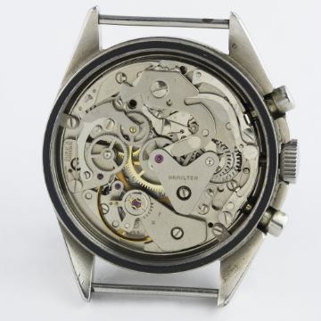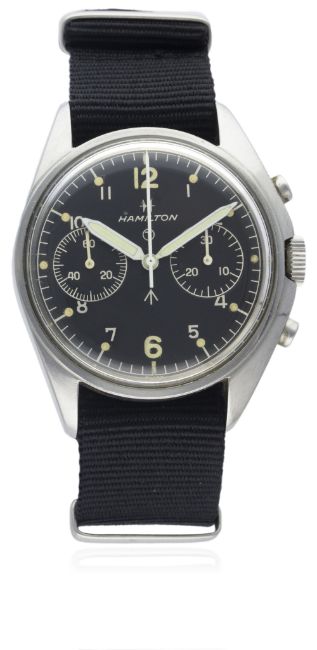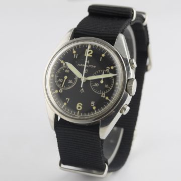A GENTLEMAN'S STAINLESS STEEL BRITISH MILITARY HAMILTON RAF PILOTS CHRONOGRAPH WRIST WATCH DATED 1972 D: Black dial with Arabic numerals & tritium luminous markers, military arrow, double register recording minutes & continuous seconds. M: 17 jewel manual wind movement signed Hamilton, Valjoux calibre 7733. C: Asymmetric military case with fixed bars, numbered, issue markings 6BB/924-3306 ^ 2751/72, case diameter measures approx. 39mm. S: NATO strap.CONDITION REPORT D: Original dial in excellent condition. M: Working at present. C: In very good condition, with some light scratches due to use. S: In excellent condition. D: Dial / M: Movement / C: Case / S: Strap / B: Bracelet