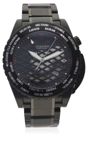 A GENTLEMAN'S PVD COATED VOGARD TIMEZONER GMT WORLD TIME BRACELET WATCH DATED 2016, UNWORN WITH ORIGINAL BOX, PAPERS & TAGS, LIMITED EDITION OF 199 PIECES & STILL UNDER MANUFACTURERS WARRANTY D: Black "lattice" dial, outer chapter ring with luminous markers & quarterly Arabic numerals, date aperture. M: Automatic movement. C: Circular case with rotating world time bezel, signed Vogard Radiator & numbered, original crown, case diameter measures approx. 44mm. B: Original PVD coated Vogard bracelet.CONDITION REPORT D: Original dial in mint condition. M: Working at present. C: In excellent condition. S: In excellent condition. D: Dial / M: Movement / C: Case / S: Strap / B: Bracelet