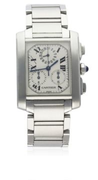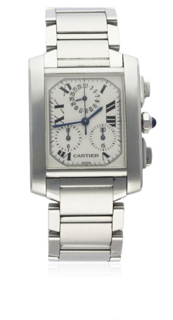 A GENTLEMAN'S STAINLESS STEEL CARTIER TANK FRANCAISE CHRONOGRAPH BRACELET WATCH CIRCA 2004, REF. 2303 D: Silver dial with Roman numerals, secret signature at X, double register recording hours & minutes, top sub-dial displaying date. M: Quartz movement signed Cartier. C: Curved Tank case, signed Cartier & numbered, original sapphire crown & pushers, case measures approx. 37mm by 28mm. B: Original Cartier stainless steel bracelet.CONDITION REPORT D: Original dial in excellent condition. M: Working at present. C: In excellent condition, with some light scratches. S: In excellent condition, with light scratches due to general use. D: Dial / M: Movement / C: Case / S: Strap / B: Bracelet