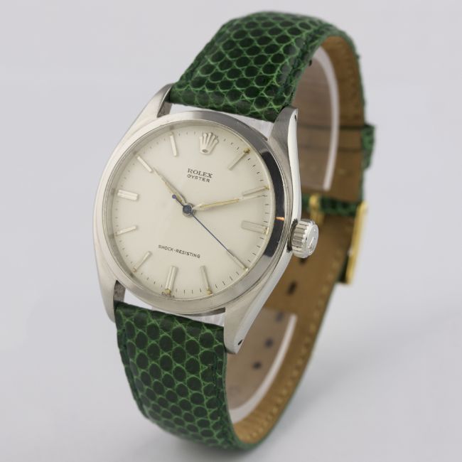 A GENTLEMAN'S STAINLESS STEEL ROLEX OYSTER WRIST WATCH CIRCA 1953, REF. 6022  D: Silver dial with silver batons & "dagger" hands. M: 15 jewel manual wind movement, signed Rolex, calibre 710. C: Oyster case, signed Montres Rolex S.A., dated I.53, numbered, Rolex crown, case diameter measures approx. 35mm. S: Green leather strap.CONDITION REPORT D: Original dial in excellent condition. M: Working at present. C: In excellent condition. S: In excellent condition. D: Dial / M: Movement / C: Case / S: Strap / B: Bracelet