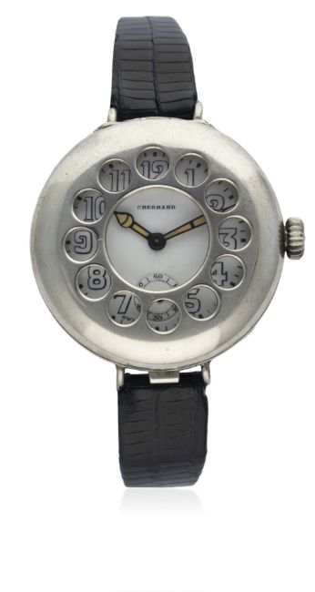 A GENTLEMAN'S SOLID SILVER EBERHARD HALF HUNTER OFFICERS WRIST WATCH CIRCA 1918 D: White enamel dial with Arabic numerals, subsidiary seconds. M: 15 jewel manual wind movement signed Eberhard & Co. C: Circular "trench" style hinged case with "telephone dial" case lid, hallmarked & numbered, case diameter measures approx. 36mm. S: Leather strap.CONDITION REPORT D: Original dial in very good condition with some hairline cracks. M: Working at present. C: In very good condition. S: In good condition. D: Dial / M: Movement / C: Case / S: Strap / B: Bracelet