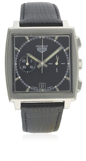 A GENTLEMAN'S STAINLESS STEEL HEUER MONACO CHRONOGRAPH WRIST WATCH CIRCA 2000, REF. CS2110 LIMITED EDITION OF 5000 PIECES WITH TAG HEUER BOX & OPEN PAPERS D: Black dial with silver batons, inner tracking with luminous markers, single register recording minutes, subsidiary seconds, date aperture at 6 o'clock. M: Automatic movement signed Heuer. C: Classic Monaco case, signed Heuer Monaco with limited edition number, original Heuer crown & pushers, case width measures approx. 38mm. S: Black leather strap with Heuer pin buckle.CONDITION REPORTD: Original dial in excellent condition, luminous showing some patina. M: Working at present. C: In very good condition. S: In excellent condition. D: Dial / M: Movement / C: Case / S: Strap / B: Bracelet