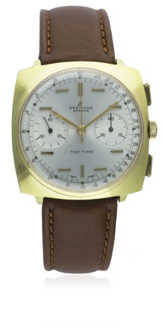 A GENTLEMAN'S GOLD PLATED BREITLING TOP TIME CHRONOGRAPH WRIST WATCH CIRCA 1970, REF. 2008D: Silver dial with straight & horizontal gilt batons, double register recording minutes & continuous seconds, outer tachymetre scale. M: Manual wind movement signed Breitling Watch Ltd. C: Cushion shaped case with stainless steel back, signed Breitling, Breitling crown, case width measures approx. 37mm. S: Brown leather strap.CONDITION REPORTD: Original dial in excellent condition. M: Working at present. C: In excellent condition, with some light scratches due to general use. S: In excellent condition. D: Dial / M: Movement / C: Case / S: Strap / B: Bracelet