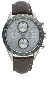 A GENTLEMAN'S STAINLESS STEEL TAG HEUER CARRERA AUTOMATIC CHRONOGRAPH WRIST WATCH CIRCA 2005, REF. CV2011 D: Silver & grey dial with silver batons & hands, double register recording hours & minutes, subsidiary seconds, date aperture. M: Automatic movement signed TAG Heuer, calibre 16. C: Carrera case with grey tachymeter bezel, exhibition back signed Carrera & numbered, original crown & pushers, case diameter measures approx. 41mm. S: Brown leather strap & deployment clasp.CONDITION REPORTD: Original dial in excellent condition. M: Working at present. C: In very good condition with some scratches due to general use. S: New. D: Dial / M: Movement / C: Case / S: Strap / B: Bracelet