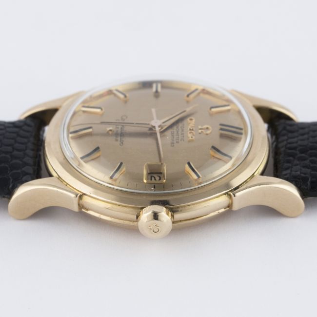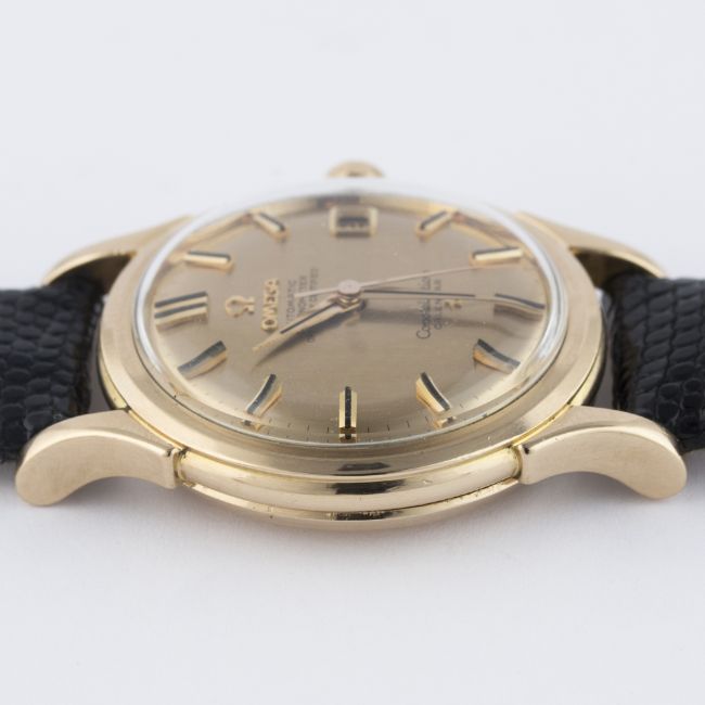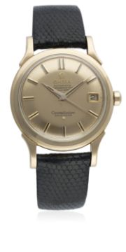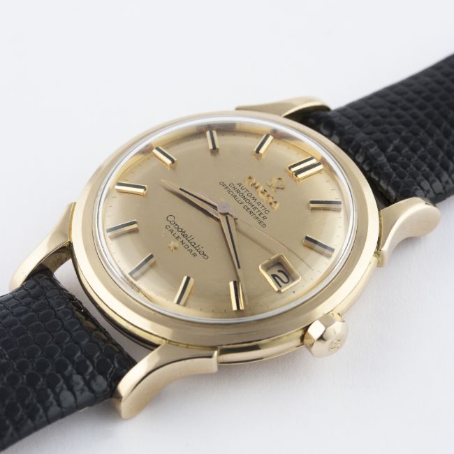 A FINE & RARE GENTLEMAN'S 18K SOLID PINK GOLD OMEGA CONSTELLATION CALENDAR WRIST WATCH CIRCA 1960, REF. 2943/2954 SC WITH OMEGA BOX D: Pink gold dial with black inlaid gilt batons & dauphine hands, date aperture. M: 24 jewel automatic chronometer movement signed Omega Watch Co. & numbered, calibre 505. C: Circular snap back case, signed Omega Watch Co, 18k hallmarks, Constellation badge embossed on case back with long service inscription, original crown, case diameter measures approx. 35mm. S: Black leather strap with original Omega pin buckle.CONDITION REPORTD: Original dial in excellent condition. M: Working at present. C: In excellent condition, with some light scratches due to occasional use. S: In excellent condition. D: Dial / M: Movement / C: Case / S: Strap / B: Bracelet