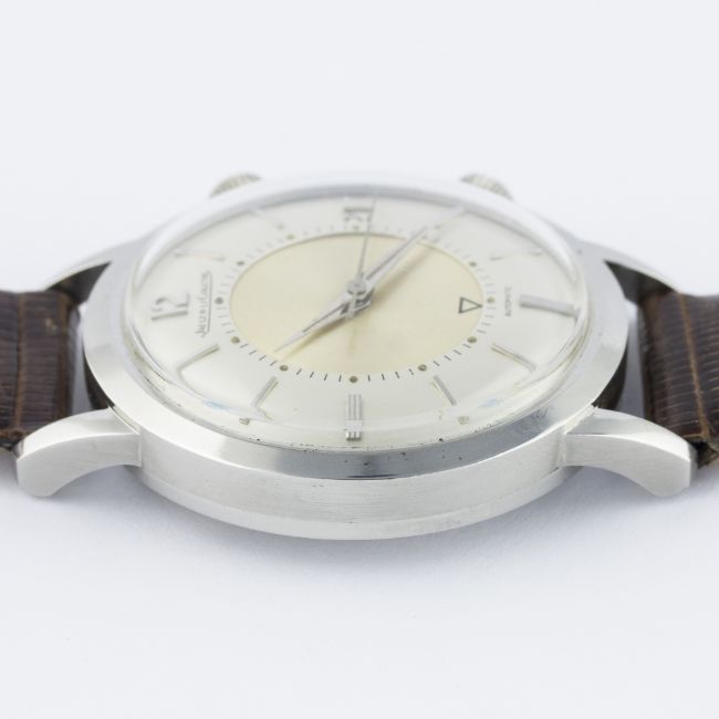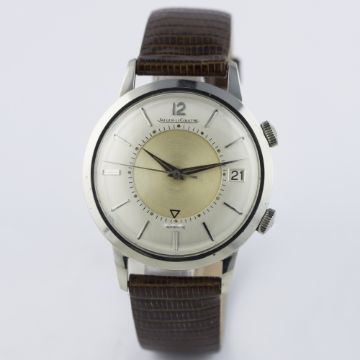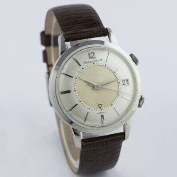 A GENTLEMAN'S STAINLESS STEEL JAEGER LECOULTRE MEMOVOX AUTOMATIC ALARM WRIST WATCH CIRCA 1960sD: Silver dial with silver batons & dauphine hands, inner rotating dial with pointer to set alarm, date aperture. M: "Bumper" automatic movement signed Jaeger-LeCoultre & numbered. C: Circular case with two part case back, signed LeCoultre Co. Memovox & numbered, JLC crowns, case diameter measures approx. 37mm. S: Brown leather strap.CONDITION REPORTD: Dial in excellent condition. M: Working at present. C: In excellent condition. S: In excellent condition.D: Dial / M: Movement / C: Case / S: Strap / B: Bracelet
