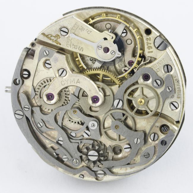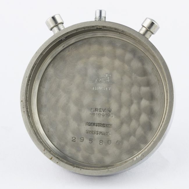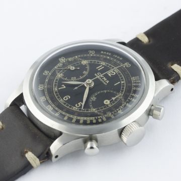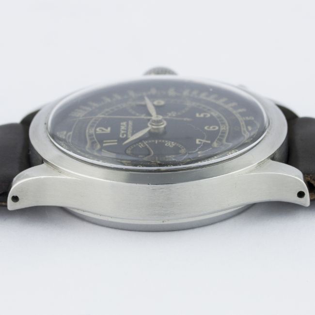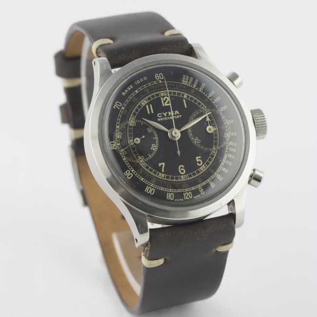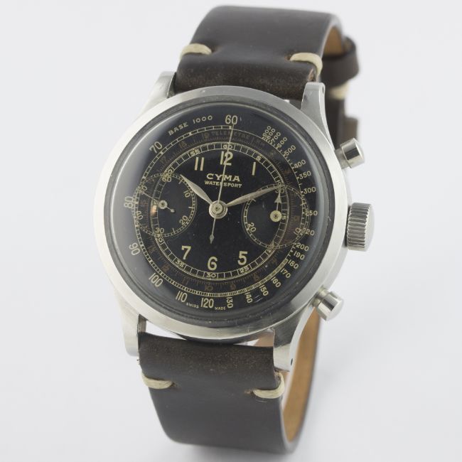 A VERY RARE GENTLEMAN'S LARGE SIZE STAINLESS STEEL CYMA WATERSPORT "CLAMSHELL" CHRONOGRAPH WRIST WATCH CIRCA 1940sD: Gloss black dial with gilt Arabic numerals & hands, gilt font & tracking, double register recording minutes & continuous seconds, outer telemetre & tachymetre scales. M: 17 jewel manual wind movement signed Cyma & numbered, calibre 400L, Valjoux base calibre 22. C: Circular waterproof case held tight with four screws, signed Trusty with dog symbol matching movement, numbered, patent number, case diameter measures approx. 38mm. S: Brown Horween leather strap.CONDITION REPORTD: Original dial in excellent condition, showing some very small signs of age. M: Working at present. C: In excellent condition, with some light scratches due to general use. S: In excellent condition. D: Dial / M: Movement / C: Case / S: Strap / B: Bracelet