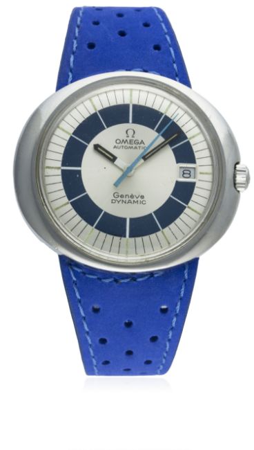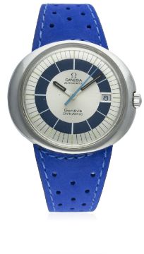 A GENTLEMAN'S STAINLESS STEEL OMEGA GENEVE DYNAMIC AUTOMATIC WRIST WATCH CIRCA 1970s D: Blue & silver dial, date aperture, light blue centre seconds hand. M: Automatic movement signed Omega & numbered. C: Oval shaped case, signed Omega Watch Co., Omega crown, case width measures approx. 41mm. S: Perforated blue leather strap.CONDITION REPORTD: Original dial in excellent condition. M: Working at present. C: In very good condition, with some light scratches due to general use. S: In excellent condition. D: Dial / M: Movement / C: Case / S: Strap / B: Bracelet