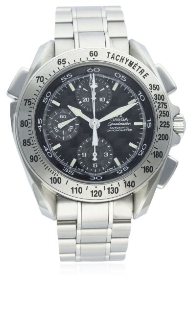 A GENTLEMAN'S STAINLESS STEEL OMEGA SPEEDMASTER RATTRAPANTE CHRONOGRAPH BRACELET WATCH CIRCA 2005, REF. 35405000 WITH ORIGINAL PAPERSD: Carbon fibre dial with luminous hour & 5 minute markers, triple register recording hours, minutes & continuous seconds. M: Automatic chronometer movement, signed Omega & numbered. C: Circular case with tachymetre bezel, signed Omega, Speedmaster emblem embossed on case back, numbered, original crown & pushers, case diameter measures approx. 42mm. B: Omega Speedmaster stainless steel bracelet.CONDITION REPORTD: Original dial in excellent condition. M: Working at present. C: In excellent condition with some light scratches due to general use. B: In excellent condition. D: Dial / M: Movement / C: Case / S: Strap / B: Bracelet