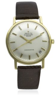A GENTLEMAN'S 18K SOLID GOLD ZENITH 28800 AUTOMATIC CHRONOMETRE WRIST WATCH CIRCA 1960s, REF. 1209 7 SPD: Brushed silver dial with gilt batons & hands, off-set date aperture. M: 23 jewel automatic movement signed Zenith & numbered, calibre 2562 PC. C: Circular screw back case, signed Zenith, 18k hallmarks, Zenith crown, case diameter measures approx. 35mm. S: Brown leather strap.CONDITION REPORTD: Original dial in excellent condition, showing some small signs of age. M: Working at present. C: In good condition, with some light scratches & a light dent to left side of the case. S: In excellent condition. D: Dial / M: Movement / C: Case / S: Strap / B: Bracelet