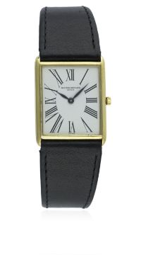 A GENTLEMAN'S 18K SOLID GOLD VACHERON CONSTANTIN RECTANGULAR WRIST WATCH CIRCA 1970s WITH VC POUCHD: White dial with Roman numerals. M: Manual wind movement, signed Vacheron Constantin & numbered C: Rectangular case, signed Vacheron Constantin, hallmarked & numbered, case measures approx. 39mm by 23mm. S: Black leather strap with original VC 18k solid gold pin buckle.CONDITION REPORTD: Original dial in excellent condition. M: Working at present. C: In excellent condition with some light scratches due to general use. S: In excellent condition. D: Dial / M: Movement / C: Case / S: Strap / B: Bracelet