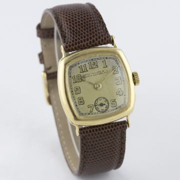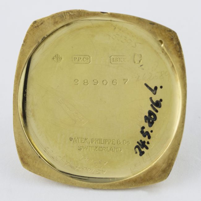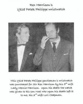 A RARE GENTLEMAN'S 18K SOLID GOLD PATEK PHILIPPE WRIST WATCH CIRCA 1928, WITH A LETTER FROM THE 3RD WIFE (CONSIGNEE) OF REX HARRISON WHO OWNED THE WATCH, UPON HIS DEATH THE WATCH WAS GIVEN TO HIS SON NOEL HARRISON WHO THEN LEFT IT TO HIS MOTHER (CONSIGNEE)D: Silver dial with gilt Arabic numerals, subsidiary seconds. M: 18 jewel manual wind movement signed Patek Philippe & Co., Shreve & Co, San Francisco, numbered. C: Cushion shaped case, signed Patek Philippe & Co & numbered, 18k hallmarks, Patek Philippe crown, initials engraved on case back, case width measures approx. 31mm. S: Brown leather strap.CONDITION REPORTD: Dial in good condition. M: Working at present. C: In good condition with some wear due to general use. S: New. D: Dial / M: Movement / C: Case / S: Strap / B: Bracelet