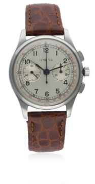 A GENTLEMAN'S STAINLESS STEEL LEMANIA CHRONOGRAPH WRIST WATCH CIRCA 1940sD: Silver dial with Arabic numerals, blue steel hands, double register recording minutes & continuous seconds, red outer tachymetre scale. M: 17 jewel manual wind movement, numbered. C: Circular case, numbered, case diameter measures approx. 35mm. S: Brown leather strap.CONDITION REPORTD: Original dial in excellent condition, showing some very small signs of age. M: Working at present. C: In very good condition, with some light scratches due to general use. S: In very good condition. D: Dial / M: Movement / C: Case / S: Strap / B: Bracelet