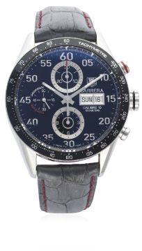 A GENTLEMAN'S STAINLESS STEEL TAG HEUER CARRERA CALIBRE 16 AUTOMATIC CHRONOGRAPH WRIST WATCH CIRCA 2013, REF. CV2A10 WITH TAG HEUER BOXD: Black dial with silver Arabic numerals for 60 seconds, double register recording hours & minutes, subsidiary seconds, day & date apertures. M: 25 jewel automatic movement signed TAG Heuer, calibre 16. C: Carrera case with black tachymetre bezel, exhibition back signed Carrera & numbered, original crown & pushers, case diameter measures approx. 44mm. S: Grey leather strap with TAG Heuer deployment clasp.CONDITION REPORTD: Original dial in excellent condition. M: Working at present. C: In very good condition, with some small scratches due to general use. S: In good condition.D: Dial / M: Movement / C: Case / S: Strap / B: Bracelet