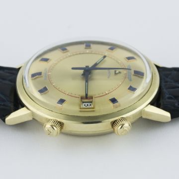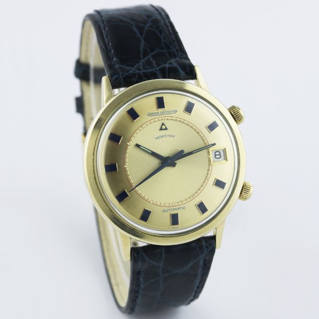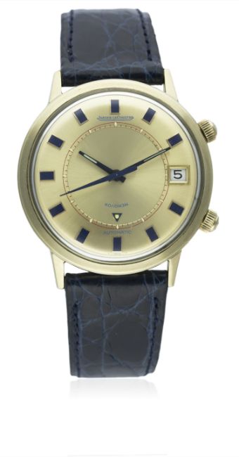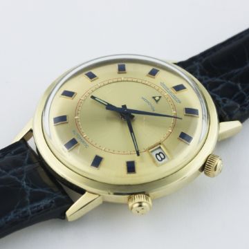 A RARE GENTLEMAN'S GOLD FILLED JAEGER LECOULTRE MEMOVOX AUTOMATIC ALARM WRIST WATCH CIRCA 1970D: Gold coloured dial with blue inlaid gilt markers & blue hands, blue font & red inner track, inner rotating dial with pointer to set alarm, date aperture. M: Automatic movement signed Jaeger-LeCoultre & numbered. C: Circular case, signed & numbered, JLC crowns, case diameter measures approx. 37mm. S: Blue leather strap.CONDITION REPORTD: Original dial in excellent condition. M: Working at present. C: In excellent condition, with some light scratches due to general use. S: In excellent condition. D: Dial / M: Movement / C: Case / S: Strap / B: Bracelet