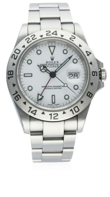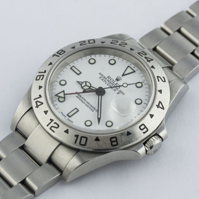 A GENTLEMAN’S STAINLESS STEEL ROLEX OYSTER PERPETUAL DATE EXPLORER II BRACELET WATCH DATED 2002, REF 16570 WITH ORIGINAL BOX D: White dial with luminous inlaid black markers & Mercedes hands, dual time zone arrow hand, date aperture. M: 31 jewel automatic chronometer movement, signed Montres Rolex S.A & numbered, calibre 3185. C: Oyster case with fixed 24 hour bezel & sapphire crystal, signed Montres Rolex S.A., Y serial no., Rolex crown, case diameter measures approx 39mm. B: Rolex Oyster bracelet with flip-lock clasp, numbered 78790A.CONDITION REPORTD: Original dial in excellent condition. M: Working at present. C: In excellent condition, with some scratches due to general use. B: In excellent condition, with some scratches due to general use. D: Dial / M: Movement / C: Case / S: Strap / B: Bracelet