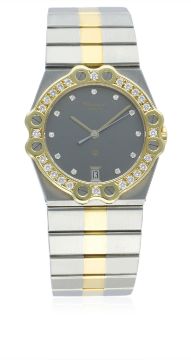 A GENTLEMAN'S STAINLESS STEEL, SOLID GOLD & DIAMOND CHOPARD ST. MORITZ BRACELET WATCH, CUFFLINKS & RING SET IN ORIGINAL BOX CIRCA 1990s D: Grey dial with diamond set markers, date aperture. M: Quartz movement signed Chopard. C: Tonneau shaped case with original diamond set solid gold bezel, signed Chopard & numbered, original crown, case width measures approx. 32mm. B: Original Chopard steel & gold bracelet. The cufflinks and ring are in 18k yellow & white gold with mother of pearl.CONDITION REPORTD: Original dial in excellent condition. M: Not working at present, in need a service. C: In excellent condition. B: In excellent condition.The watch, cufflinks and ring look to have been worn only occasionally, the box exterior is in poor condition. D: Dial / M: Movement / C: Case / S: Strap / B: Bracelet