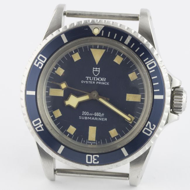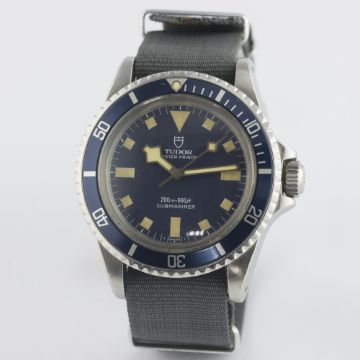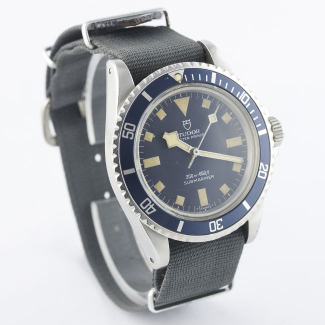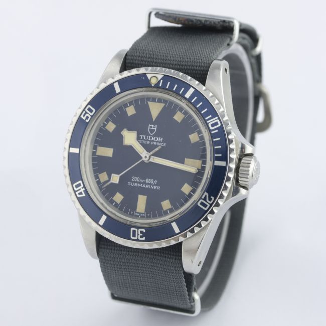 A VERY RARE GENTLEMAN'S STAINLESS STEEL FRENCH MILITARY MARINE NATIONALE ROLEX TUDOR OYSTER PRINCE "SNOWFLAKE" SUBMARINER WRIST WATCH DATED 1981, REF. 94010 D: Blue dial with luminous markers & "snowflake" hands. M: 25 jewel automatic movement, signed Tudor Auto-Prince. C: 'Rolex Oyster' case with blue 60 minute rotating bezel, signed Montres Tudor S.A., case back issue markings M.N.81, numbered, Rolex triplock crown, case diameter measures approx. 40mm. S: Grey NATO strap.CONDITION REPORTD: Original dial in excellent condition, luminous showing a nice patina. M: Working at present. C: In excellent condition, with some small scratches due to use, showing no signs of a bracelet having been fitted to the watch. S: In very good condition. D: Dial / M: Movement / C: Case / S: Strap / B: Bracelet