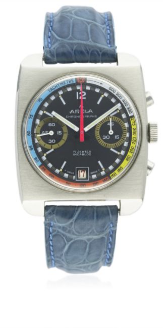 A GENTLEMAN'S STAINLESS STEEL AROLA CHRONOGRAPH WRIST WATCH CIRCA 1970s D: Black dial with grey markers & chequered tracking, double register recording minutes & continuous seconds, multicoloured outer tachymetre scale, red centre chronograph hand, date aperture. M: 17 jewel manual wind incabloc movement, Valjoux calibre 7734. C: Square shaped case, starfish emblem embossed on case back, numbered, case width measures approx. 36mm. S: Blue leather strap. CONDITION REPORTD: Original dial in excellent condition. M: Working at present. C: In excellent condition. S: In good condition.  D: Dial / M: Movement / C: Case / S: Strap / B: Bracelet