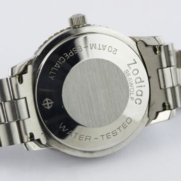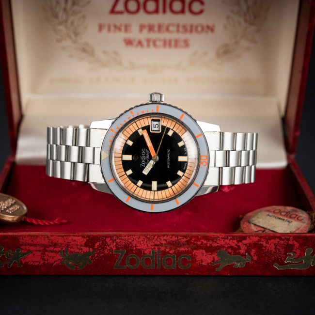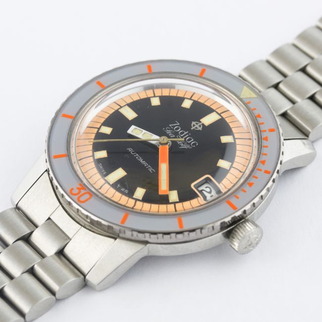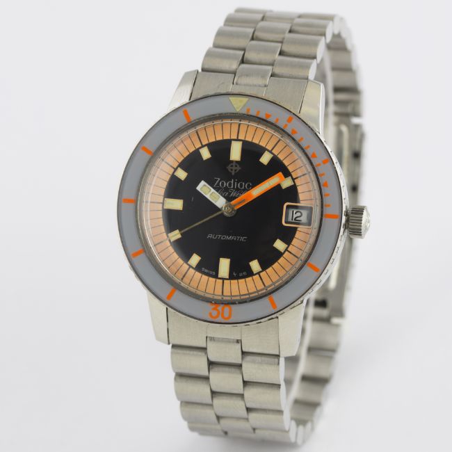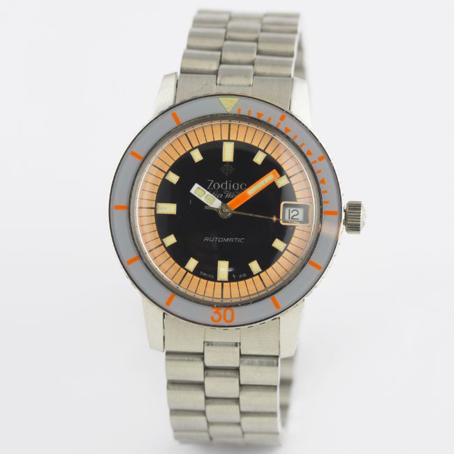 A GENTLEMAN'S "NOS" STAINLESS STEEL ZODIAC SEA WOLF AUTOMATIC DIVERS BRACELET WATCH CIRCA 1970 WITH ORIGINAL BOX, TAG & CASE BACK STICKERD: Gloss black dial with luminous markers & hands, orange surround with minutes/seconds tracking, orange minute hand, date aperture. M: Automatic movement signed Zodiac. C: Circular case with grey & orange bakelite 60 minute rotating bezel, signed Zodiac SeaWolf, original crown, case diameter measures approx. 36mm. B: Original Zodiac stainless steel bracelet.CONDITION REPORTD: Original dial in excellent condition. M: Working at present. C: In excellent condition. B: In excellent condition.The watch is in new old stock condition. D: Dial / M: Movement / C: Case / S: Strap / B: Bracelet