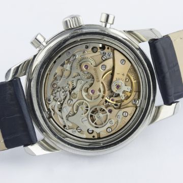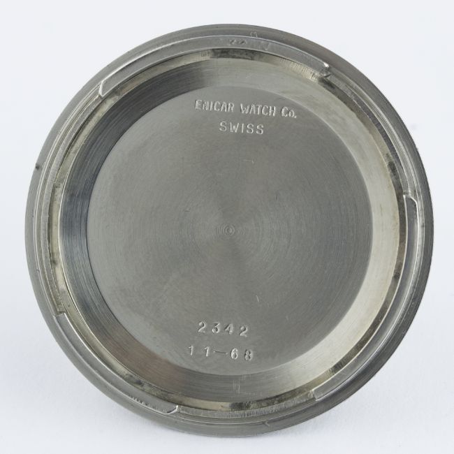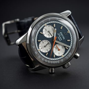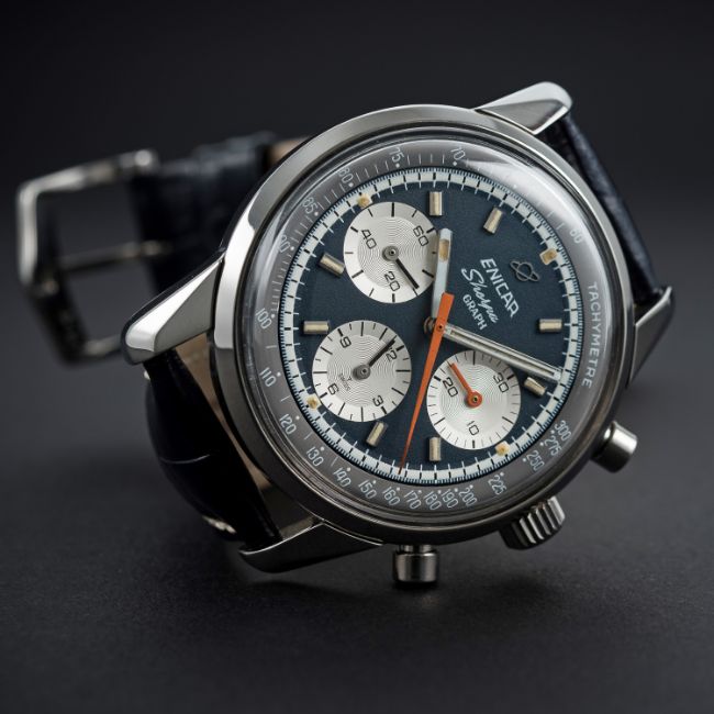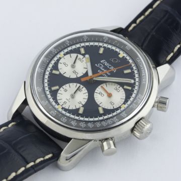 A RARE GENTLEMAN'S STAINLESS STEEL ENICAR SHERPA GRAPH CHRONOGRAPH WRIST WATCH CIRCA 1968D: Navy blue dial with luminous inlaid silver batons, three silver registers recording hours, minutes & continuous seconds, orange centre chronograph hand, grey inner bezel with tachymetre scale. M: 17 jewel manual wind movement signed Enicar, Valjoux calibre 726. C: Large circular screw back case, signed Enicar Watch Co. & numbered, Sherpa 300 emblem embossed on case back, Enicar anti-slip crown, case diameter measures approx. 40mm. S: Navy blue leather strap.CONDITION REPORTD: Original dial in excellent condition. M: Working at present. C: In very good condition. S: In very good condition. D: Dial / M: Movement / C: Case / S: Strap / B: Bracelet