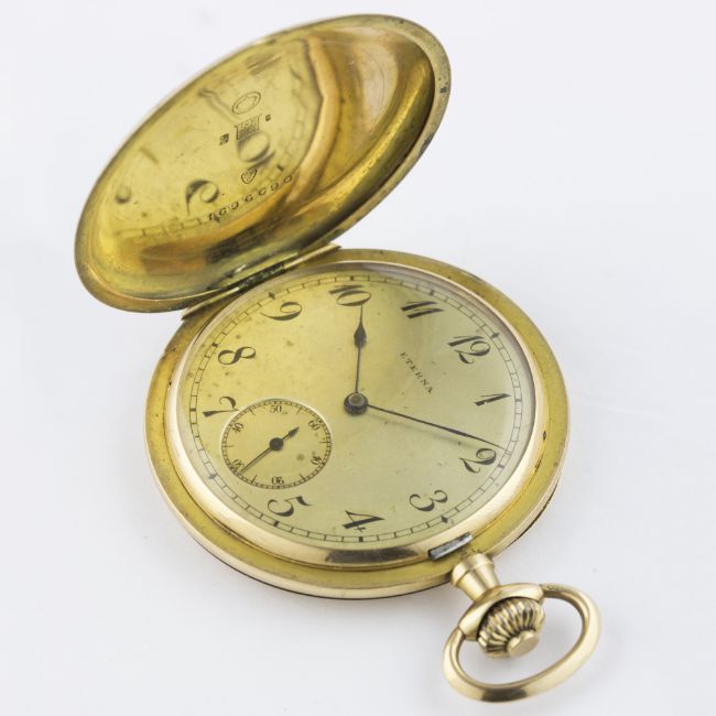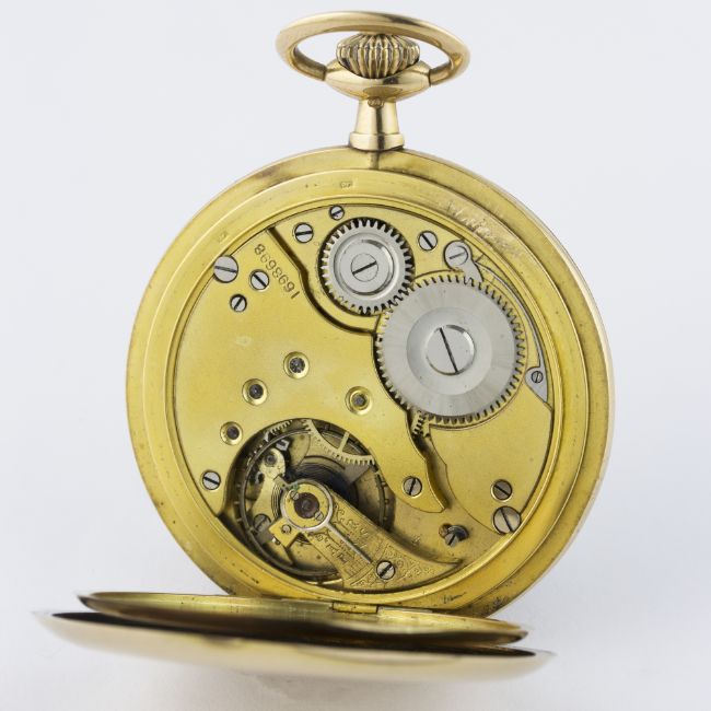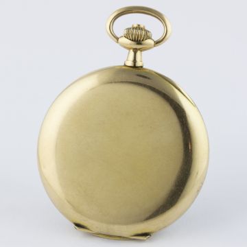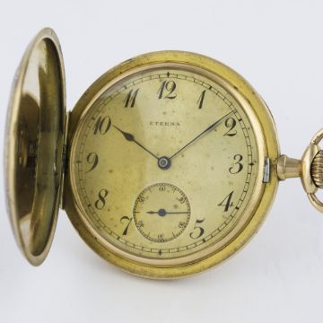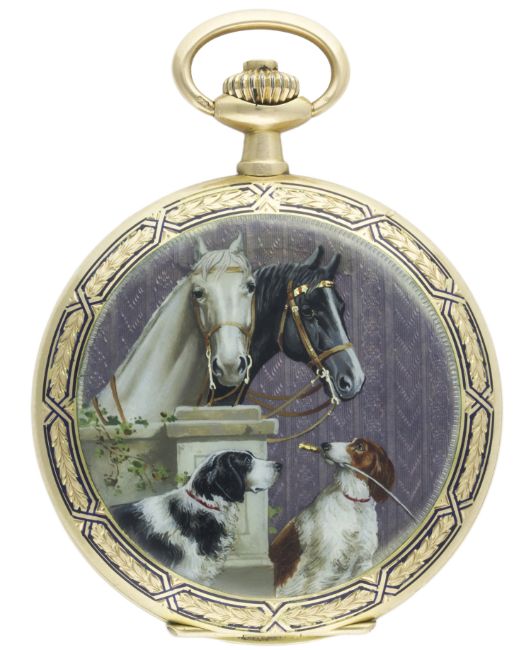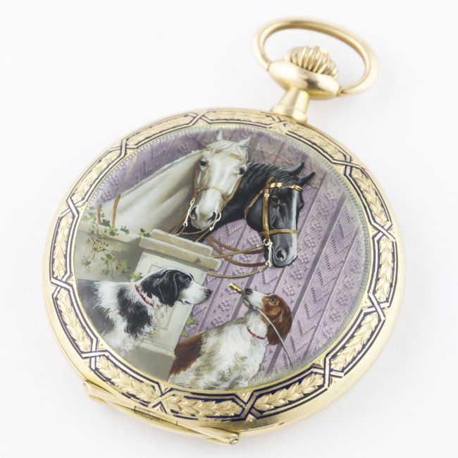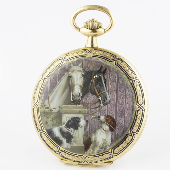 A FINE & RARE GENTLEMAN'S 14K SOLID GOLD & ENAMEL FULL HUNTER ETERNA POCKET WATCH CIRCA 1910D: Gold coloured dial with Arabic numerals, outer minute track & subsidiary seconds. M: Keyless wind movement, numbered. C: Circular hinged case, front cover depicting a scene of two horses looking out over two dogs, case diameter measures approx. 50mm excluding the neck & bow.CONDITION REPORTD: Original dial in good condition. M: Working at present. C: In excellent condition, no damage to the enamel seen, some enamel missing in the finer emailing around the front cover bezel. D: Dial / M: Movement / C: Case / S: Strap / B: Bracelet