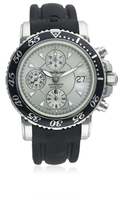 A GENTLEMAN'S STAINLESS STEEL MONTBLANC MEISTERSTUCK AUTOMATIC CHRONOGRAPH WRIST WATCH CIRCA 2005, REF. 7034D: Silver dial with triangular luminous markers, triple register recording hours, minutes & continuous seconds, date aperture. M: Automatic movement signed Montblanc Meisterstuck. C: Circular case with black 60 minute rotating bezel, signed Montblanc & numbered, original crown & pushers, case diameter measures approx. 42mm. S: Original Montblanc rubber strap & deployment clasp.CONDITION REPORTD: Original dial in excellent condition. M: Working at present. C: In excellent condition, with some surface scratches due to general use. S: In excellent condition. D: Dial / M: Movement / C: Case / S: Strap / B: Bracelet