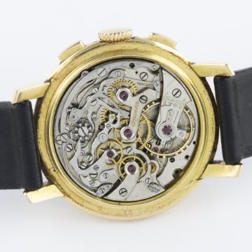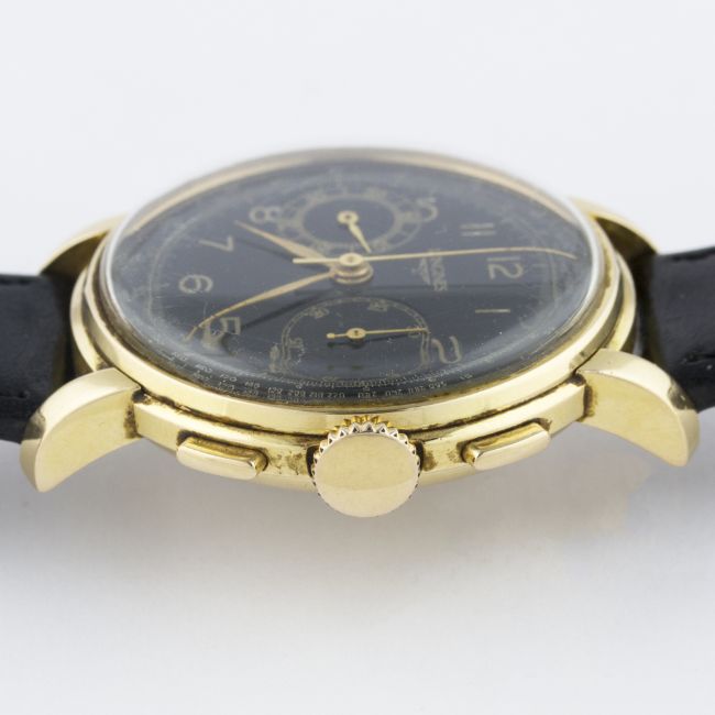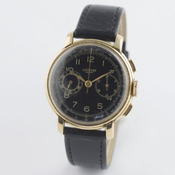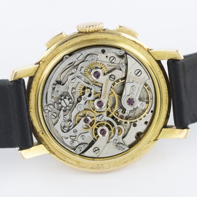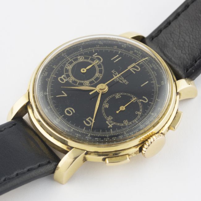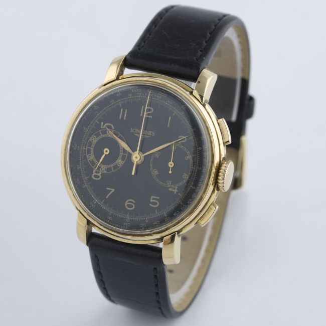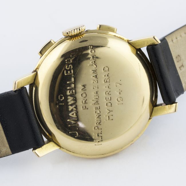 A GENTLEMAN'S 18K SOLID GOLD LONGINES 13ZN FLYBACK CHRONOGRAPH WRIST WATCH CIRCA 1946, PRESENTED BY HIS ROYAL HIGHNESS PRINCE MOAZZAM JAH OF HYDERABAD IN 1947D: Black dial with Arabic numerals & gilt hands, double register recording minutes & continuous seconds, outer base & telemetre scales. M: Manual wind movement signed Longines & numbered, calibre 13ZN. C: Circular case, presentational inscription to case back, hallmarked, case diameter measures approx. 38mm. S: Black leather strap.CONDITION REPORTD: Dial in excellent condition. M: Working at present. C: In excellent condition, with some light scratches due to general use. S: In very good condition. D: Dial / M: Movement / C: Case / S: Strap / B: Bracelet