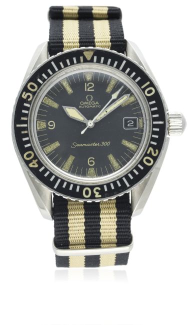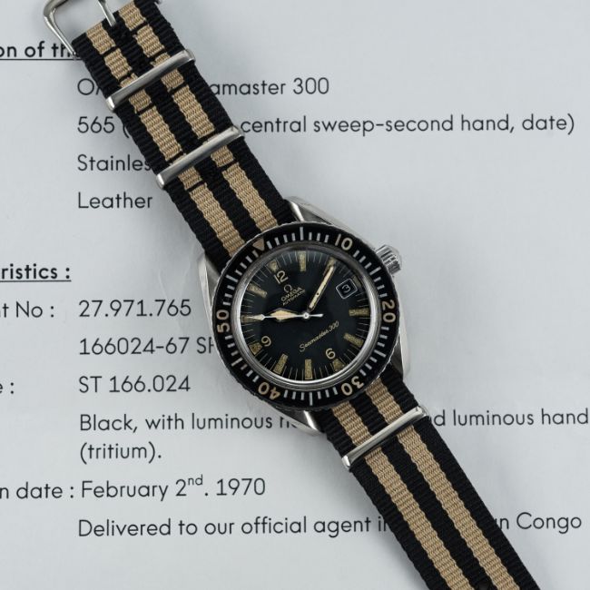 A RARE GENTLEMAN'S STAINLESS STEEL OMEGA SEAMASTER 300 DATE AUTOMATIC WRIST WATCH DATED 1970, REF. 166024-67 SP WITH OMEGA EXTRACT OF RECORDS SHOWING DELIVERY TO THE BELGIAN CONGO D: Black dial with luminous hour markers & "sword" hands, quarterly Arabic numerals, date aperture. M: 24 jewel automatic movement, signed Omega Watch Co. & numbered, calibre 565. C: Circular case with 60 minute rotating bakelite bezel, signed Omega Watch Co., Seamaster emblem on case back, Omega screw down crown, case diameter measures approx. 42mm. S: NATO strap.CONDITION REPORTD: Original dial in excellent condition, some ageing to the luminous. M: Working at present. C: In excellent condition, with some light scratches due to general use. S: In excellent condition. D: Dial / M: Movement / C: Case / S: Strap / B: Bracelet