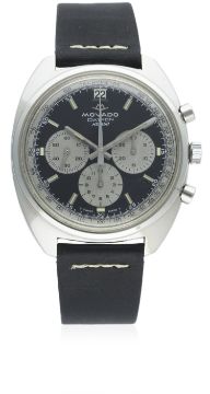 A RARE GENTLEMAN'S STAINLESS STEEL MOVADO DATRON HS360 SUB SEA CHRONOGRAPH WRIST WATCH CIRCA 1970, REF. 434-705-502D: Black dial with luminous inlaid silver batons & hands, three grey registers recording hours, minutes & continuous seconds, grey surround with tachymetre scale, date aperture. M: 17 jewel automatic movement signed Movado Factories, calibre 3019 PHC. C: Tonneau shaped case, signed Movado Factories & numbered, case width measures approx. 38mm. S: Black leather strap.CONDITION REPORTD: Original dial in excellent condition. M: Working at present. C: In excellent condition, with some light scratches due to general use. S: In excellent condition. D: Dial / M: Movement / C: Case / S: Strap / B: Bracelet