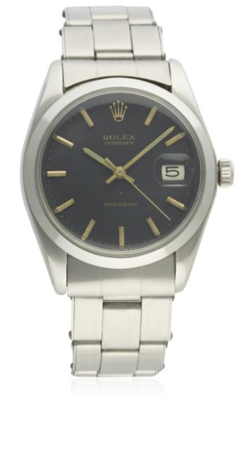 A GENTLEMAN'S STAINLESS STEEL ROLEX OYSTERDATE PRECISION BRACELET WATCH CIRCA 1972, REF. 6694 D: Matt black dial with gilt batons & hands, gilt font & tracking, date aperture. M: 17 jewel manual wind movement signed Montres Rolex S.A. & numbered, calibre 1225. C: Oyster case, signed Montres Rolex S.A., numbered, Rolex crown, case diameter measures approx. 35mm. B: Rolex Oyster riveted bracelet.CONDITION REPORTD: Original dial in very good condition, showing some small signs of age. M: Working at present. C: In excellent condition, with some light scratches due to general use. B: In excellent condition. D: Dial / M: Movement / C: Case / S: Strap / B: Bracelet