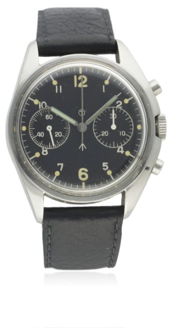 A GENTLEMAN'S STAINLESS STEEL BRITISH MILITARY CWC ROYAL NAVY CHRONOGRAPH WRIST WATCH DATED 1974 D: Black dial with silver Arabic numerals & tritium luminous markers, military arrow, double register recording minutes & continuous seconds. M: 17 jewel manual wind movement signed CWC, Valjoux calibre 7733. C: Asymmetric military case with fixed bars, numbered, issue markings 0552/924-3306 ^ 3889/74, case diameter measures approx. 39mm. S: Leather strap.CONDITION REPORTD: Original dial in excellent condition. M: Working at present. C: In excellent condition, with some small scratches due to use. S: In good condition. D: Dial / M: Movement / C: Case / S: Strap / B: Bracelet
