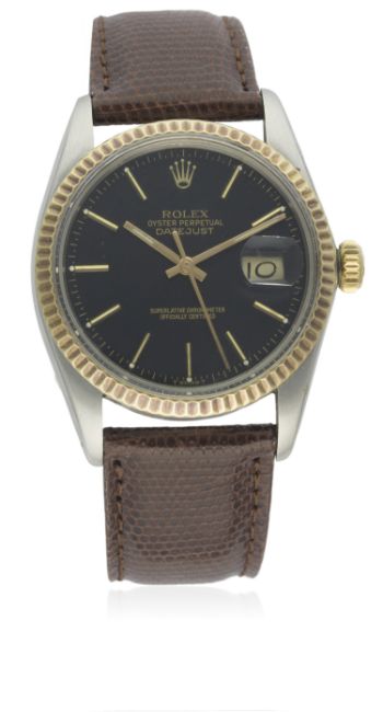 A GENTLEMAN'S STEEL & GOLD ROLEX OYSTER PERPETUAL DATEJUST WRIST WATCH CIRCA 1980, REF. 16013D: Black dial with gilt batons & hands, date aperture. M: 27 jewel automatic chronometer movement with quick-set date, signed Rolex S.A. & numbered, calibre 3035. C: Oyster case with solid gold fluted bezel, signed Montres Rolex S.A., numbered, Rolex crown, case diameter measures approx. 36mm. S: Brown leather strap.CONDITION REPORTD: Dial in excellent condition. M: Working at present. C: In very good condition, with some small scratches due to general use. S: In excellent condition. D: Dial / M: Movement / C: Case / S: Strap / B: Bracelet