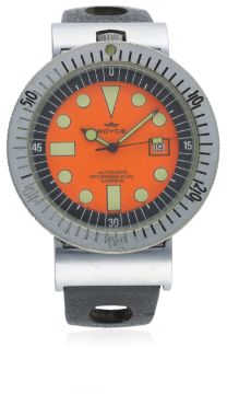 A RARE GENTLEMAN'S ROYCE PROFESSIONAL MARINE AUTOMATIC DIVERS WRIST WATCH CIRCA 1970sD: Orange dial with large luminous inlaid markers & hands, grey inner bezel with tracking, date aperture. M: 25 jewel automatic movement. C: Large circular frosted case with stainless steel screw back, hooded swivel lugs to form crown guard, 60 minute rotating bezel, signed S Kocher Grenchen, numbered, case diameter measures approx. 46mm. S: Black Tropic Sport rubber strap.CONDITION REPORTD: Original dial in excellent condition. M: Working at present. C: In very good condition, with some light scratches & wear due to general use. S: In excellent condition. D: Dial / M: Movement / C: Case / S: Strap / B: Bracelet