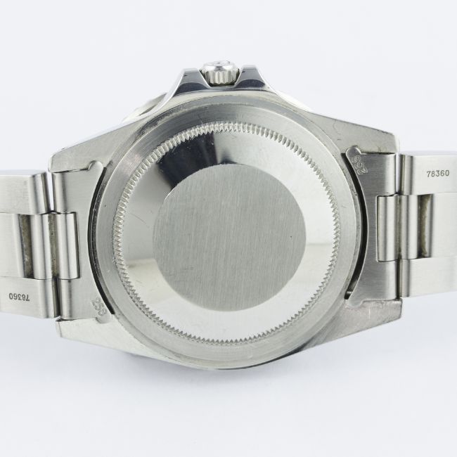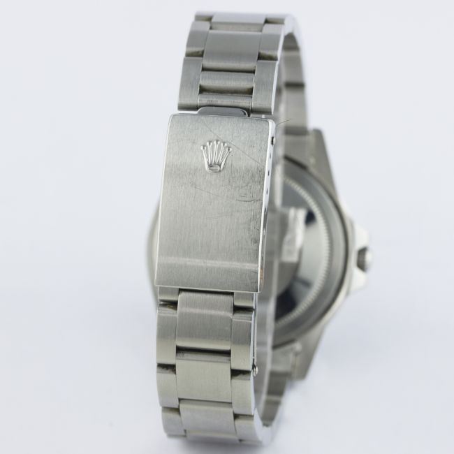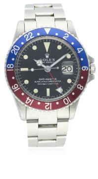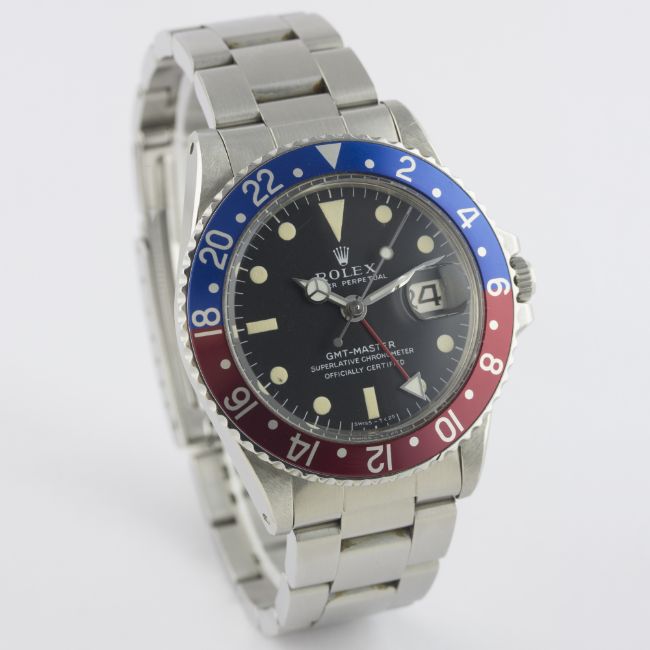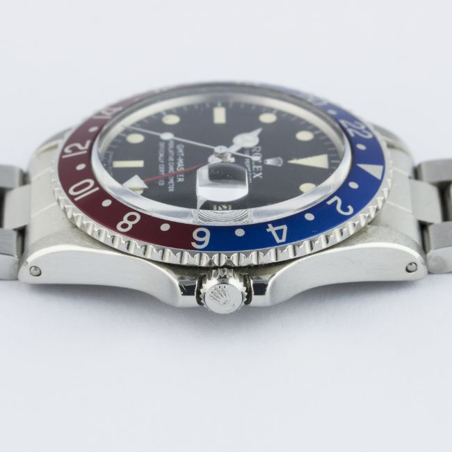 A RARE GENTLEMAN'S STAINLESS STEEL ROLEX OYSTER PERPETUAL GMT MASTER BRACELET WATCH CIRCA 1970, REF. 1675 MK1 "LONG E" DIAL, WITH ROLEX BOX & SERVICE GUARANTEE FROM 2003D: Matt black dial with luminous markers, Mercedes hands, dual time zone arrow hand, date aperture. M: 26 jewel automatic chronometer movement, signed Montres Rolex S.A. & numbered, calibre 1570. C: Oyster case with 24 hour rotating "Pepsi" bezel, signed Montres Rolex S.A., dated II.70, numbered, Rolex crown, case diameter measures approx. 40mm. B: Rolex Oyster bracelet, numbered MA5/78360/258.CONDITION REPORTD: Original dial in excellent condition, luminous on dial showing a nice patina, service hands. M: Working at present. C: In excellent condition. B: In excellent condition, with some light scratches due to occasional use. D: Dial / M: Movement / C: Case / S: Strap / B: Bracelet