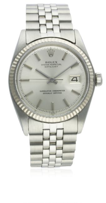 A GENTLEMAN'S STAINLESS STEEL & WHITE GOLD ROLEX OYSTER PERPETUAL DATEJUST BRACELET WATCH CIRCA 1965, REF. 1601D: Silver dial with silver batons & hands, date aperture. M: 26 jewel automatic chronometer movement, signed Montres Rolex S.A., calibre 1570. C: Oyster case with solid white gold fluted bezel, signed Montres Rolex S.A., numbered, dated IV.65, Rolex crown, case diameter measures approx. 36mm. B: Rolex Jubilee bracelet, numbered 6251H/55, dated 3.72.CONDITION REPORTD: Dial in excellent condition. M: Working at present. C: In excellent condition. B: In excellent condition.D: Dial / M: Movement / C: Case / S: Strap / B: Bracelet