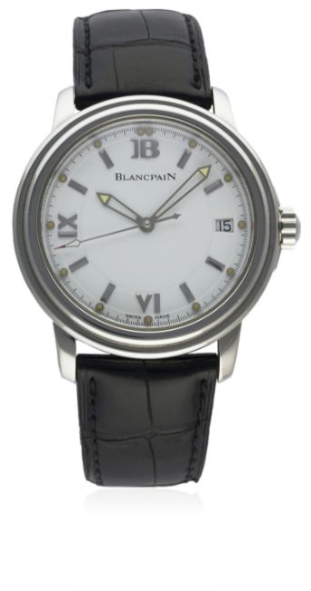 A GENTLEMAN'S STAINLESS STEEL BLANCPAIN LEMAN AUTOMATIC WRIST WATCH CIRCA 2002, REF. 2100-1127-53BD: White dial with silver batons & Roman numerals, luminous inlaid silver markers * "sword" hands, date aperture. M: 29 jewel automatic movement signed Blancpain, calibre 11.51. C: Circular case, signed Blancpain on case side, numbered, original screw down crown, case diameter measures approx. 39mm. S: Black leather strap with original Blancpain deployment clasp.CONDITION REPORTD: Original dial in excellent condition. M: Working at present. C: In excellent condition. S: In good condition. D: Dial / M: Movement / C: Case / S: Strap / B: Bracelet