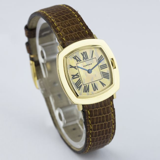 A RARE 18K SOLID GOLD CARTIER "CAMO" WRIST WATCH CIRCA 1970s WITH A RECENT LETTER FROM CARTIER CONFIRMING THE MODEL D: Three colour 18k solid gold "camo" dial with Roman numerals. M: Manual wind movement signed Cartier. C: Cushion shaped case, hallmarked & numbered, case width measures approx. 29mm. S: Brown leather strap.CONDITION REPORTD: Original dial in excellent condition. M: Working at present. C: In excellent condition. S: In good condition. D: Dial / M: Movement / C: Case / S: Strap / B: Bracelet