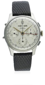 A RARE GENTLEMAN'S STAINLESS STEEL DOXA TRIPLE CALENDAR CHRONOGRAPH WRIST WATCH CIRCA 1940s