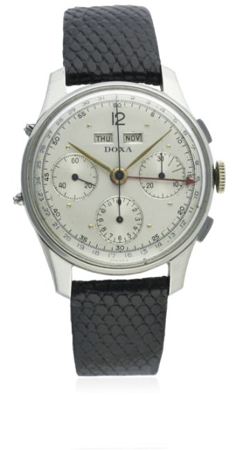 D: Silver dial with gilt dot markers & hands, triple register recording hours, minutes & continuous seconds, day & month apertures, outer date calendar. M: 17 jewel manual wind movement signed Doxa S.A, Valjoux calibre 72C. C: Circular snap back case, signed Doxa S.A, numbered, case diameter measures approx. 35mm. S: Black leather strap.