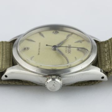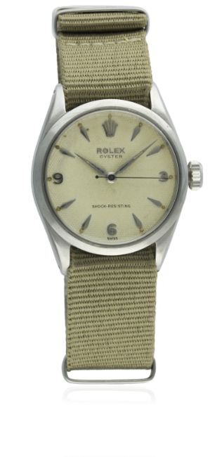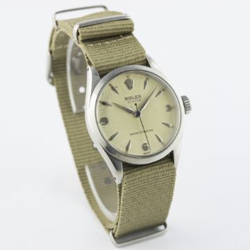 A GENTLEMAN'S MID SIZE STAINLESS STEEL ROLEX OYSTER PRECISION WRIST WATCH CIRCA 1955, REF. 6246  D: Silver "honeycomb" dial with silver 3-6-9 Arabic numerals, "dagger" batons & hands. M: 15 jewel manual wind movement, signed Rolex & numbered. C: Oyster case, signed Montres Rolex S.A., dated IV.55, numbered, Rolex crown, case diameter measures approx. 32mm. S: NATO strap.CONDITION REPORTD: Original dial in excellent condition, showing a slight patina & very small signs of age. M: Working at present. C: In excellent condition, with some light scratches due to general use. S: In excellent condition. D: Dial / M: Movement / C: Case / S: Strap / B: Bracelet