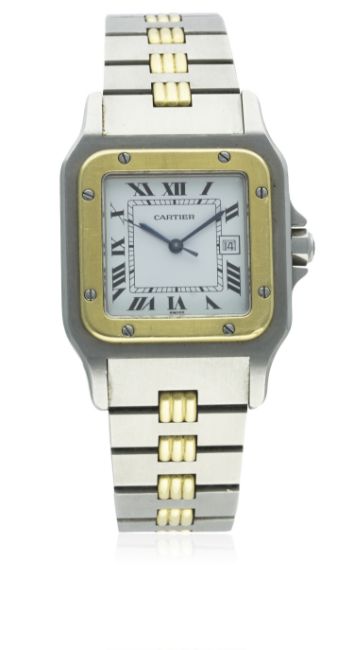 A GENTLEMAN'S STEEL & GOLD CARTIER SANTOS AUTOMATIC BRACELET WATCH CIRCA 1990s D: White dial with Roman numerals & inner minute track, secret signature at VII, date aperture. M: Automatic movement signed Cartier. C: Square Santos case with 18k solid gold bezel, signed Cartier Automatique & numbered, sapphire crown, case width measures approx. 29mm. B: Original Cartier steel & solid gold bracelet, total length measures approx. 160mm.CONDITION REPORTD: Original dial in excellent condition. M: Working at present. C: In excellent condition with some light scratches. S: In excellent condition with some scratches due to general use. D: Dial / M: Movement / C: Case / S: Strap / B: Bracelet