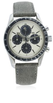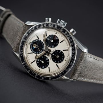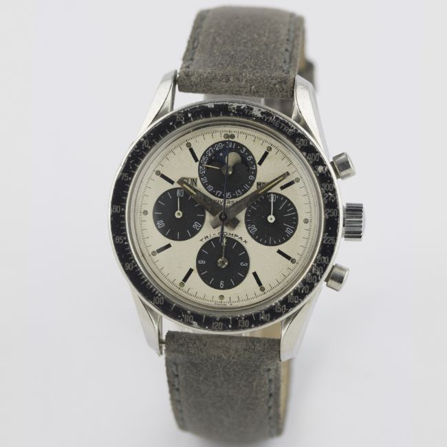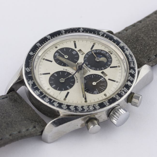 A VERY RARE GENTLEMAN'S STAINLESS STEEL UNIVERSAL GENEVE TRI COMPAX MOONPHASE TRIPLE CALENDAR CHRONOGRAPH WRIST WATCH CIRCA 1966, REF. 881101/01 D: Silver & black "panda" dial with "exclamation point" markers, day, month & moonphase apertures, four sub-dials recording hours, minutes, continuous seconds & date calendar. M: 17 jewel manual wind movement, signed Universal Geneve, calibre 281. C: Circular screw back HF case with tachymetre bezel, signed Universal Geneve, numbered, case back inscription, case diameter measures approx. 36mm. S: Leather strap. CONDITION REPORTD: Original dial in good condition, showing some small signs of age and light hand drag near the centre, the minute & hour hands are scratched and have light kinks. M: Working at present. C: In good condition with some small scratches due to general use. S: In excellent condition. D: Dial / M: Movement / C: Case / S: Strap / B: Bracelet