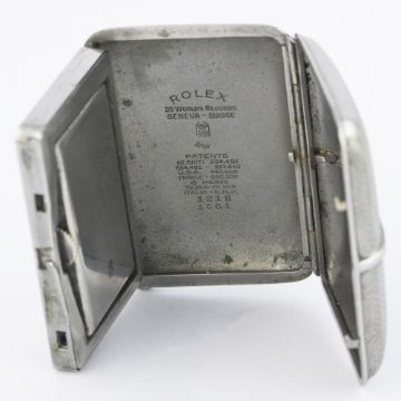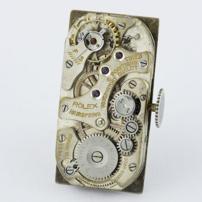 D: Two tone silver dial with Arabic numerals & markers, subsidiary seconds. M: 15 jewel manual wind movement signed Rolex Extra Prima, observatory quality, dust cover, numbered. C: Rectangular engine-turned case, signed Rolex SAR, numbered, case measures approx. 49mm by 34mm.