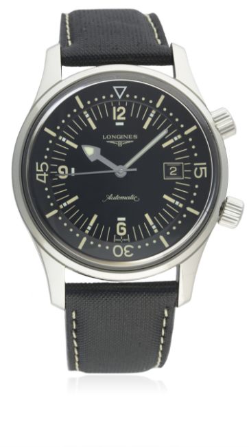 A GENTLEMAN'S STAINLESS STEEL LONGINES LEGEND DIVER WRIST WATCH DATED 2014, REF. L3.674.4 WITH BOX & PAPERSD: Gloss black dial with luminous markers & quarterly Arabic numerals, inner rotating 60 minute bezel, date aperture. M: 25 jewel automatic movement signed Longines & numbered, calibre L6332. C: Circular screw back case, signed Longines & numbered, spear diver emblem embossed on case back, original anti-slip crowns, sapphire crystal, case diameter measures approx. 42mm. S: Original Longines black leather strap & pin buckle.CONDITION REPORTD: Original dial in mint condition. M: Working at present. C: In excellent condition. S: In fair condition. D: Dial / M: Movement / C: Case / S: Strap / B: Bracelet