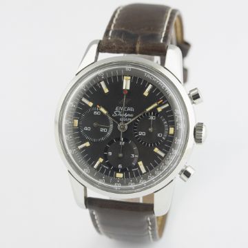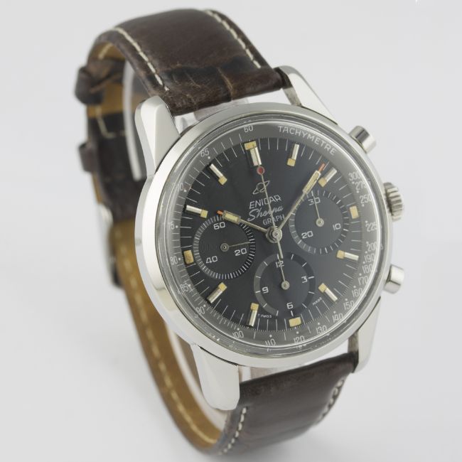 A VERY RARE GENTLEMAN'S STAINLESS STEEL ENICAR SHERPA GRAPH CHRONOGRAPH WRIST WATCH CIRCA 1960s, REF. 072-02-01D: Black dial with part-luminous silver batons & hands, triple register recording hours, minutes & continuous seconds, grey tachymetre inner bezel. M: 17 jewel manual wind movement signed Enicar, Valjoux calibre 72. C: Large circular screw back case, signed Enicar Watch Co., Sherpa 300 emblem embossed on case back, numbered, Enicar anti-slip crown, case diameter measures approx. 40mm. S: Brown leather strap.CONDITION REPORTD: Original dial in excellent condition. M: Working at present. C: In excellent condition. S: In good condition. D: Dial / M: Movement / C: Case / S: Strap / B: Bracelet