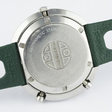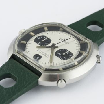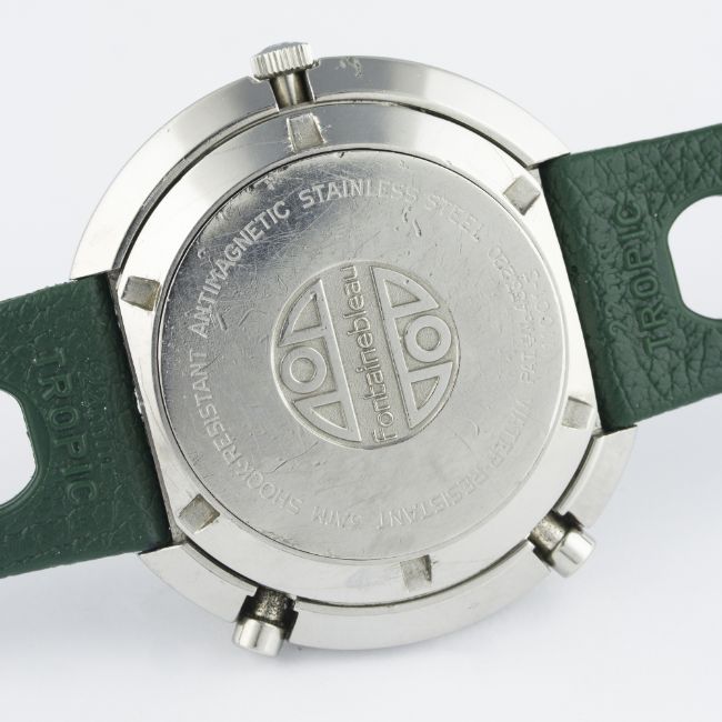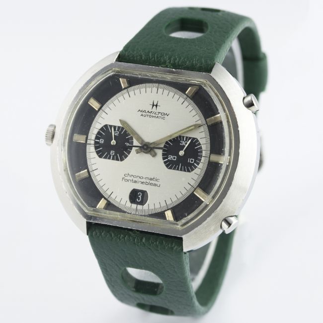 A RARE GENTLEMAN'S STAINLESS STEEL HAMILTON CHRONO-MATIC FONTAINEBLEAU AUTOMATIC CHRONOGRAPH WRIST WATCH CIRCA 1970, REF. 11001-3D: Brushed silver & black "panda" dial, black outer surround with part-luminous silver markers, double register recording minutes & hours, date aperture at 6 o'clock. M: 17 jewel automatic movement signed Hamilton, calibre 11. C: Three piece "square cambered" waterproof case, signed Hamilton Fontainebleau & numbered, original crown & pushers, case width measures approx. 47mm. S: Green Tropic Sport rubber strap.CONDITION REPORTD: Original dial in excellent condition, showing some very small signs of age. M: Working at present. C: In excellent condition, with some small scratches due to general use. S: In excellent condition. D: Dial / M: Movement / C: Case / S: Strap / B: Bracelet