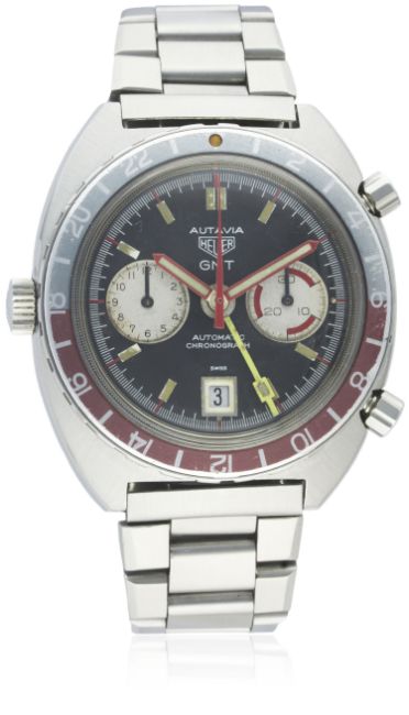 D: Black dial with luminous markers & luminous-inlaid red hands, two silver registers recording hours & minutes, date aperture at 6 o'clock, yellow GMT hand, red centre chronograph hand. M: 17 jewel automatic movement signed Heuer, calibre 14. C: Tonneau shaped case with faded blue & red 24 hour rotating bezel, signed Heuer-Leonidas S.A., numbered, original Heuer crown & pushers, case width measures approx. 42mm. B: Stainless steel Heuer bracelet.