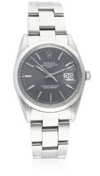 A GENTLEMAN'S STAINLESS STEEL ROLEX OYSTER PERPETUAL DATE BRACELET WATCH CIRCA 1987, REF. 15000 WITH BOX & PAPERS D: Grey dial with silver batons & hands, date aperture. M: 27 jewel automatic chronometer movement with quick-set date, signed Montres Rolex S.A., numbered, calibre 3035. C: Oyster case, signed Montres Rolex S.A., numbered, Rolex crown, case diameter measures approx. 34mm. B: Rolex Oyster bracelet.