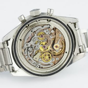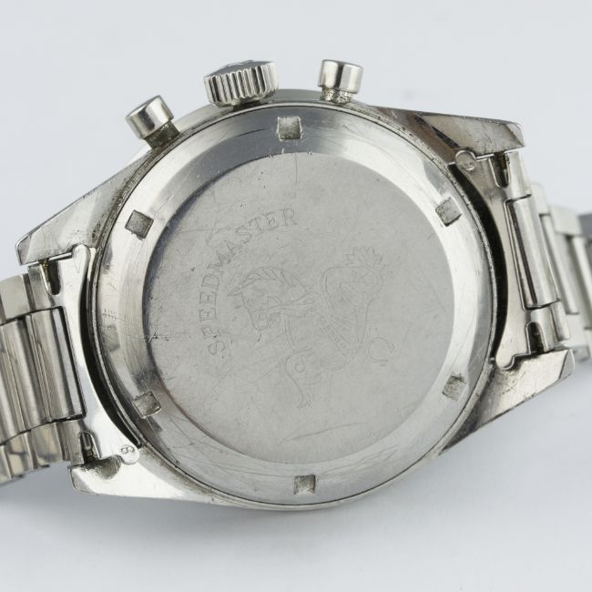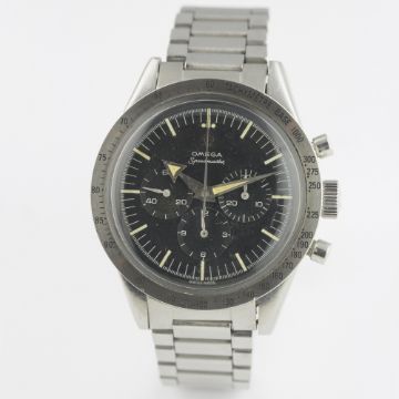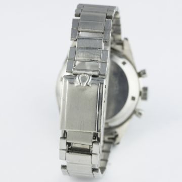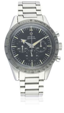 A VERY RARE GENTLEMAN'S STAINLESS STEEL OMEGA SPEEDMASTER CHRONOGRAPH BRACELET WATCH DATED 1959, REF. 2915-3 WITH OMEGA ARCHIVES D: Black dial with luminous markers, triple register recording hours, minutes & continuous seconds, "broad arrow" steel hands & "alpha" subsidiary hands. M: 17 jewel manual wind movement, signed Omega & numbered, calibre 321. C: Circular case with straight lugs, steel tachymetre bezel (Omega replacement bezel), signed Omega Watch Co., Speedmaster emblem on case back, Omega crown & pushers, dust cover, case diameter measures approx. 40mm. B: Rare Omega flat link bracelet, dated 3/59, number 6 end links.CONDITION REPORTD: An original Omega dial in excellent condition showing some patina, the dial appears to be from a ref. 2998 Speedmaster from 1960-61. M: Working at present. C: In excellent condition with some scratches & light wear due to general use. B: In excellent condition showing some scratches & light wear due to general use. D: Dial / M: Movement / C: Case / S: Strap / B: Bracelet